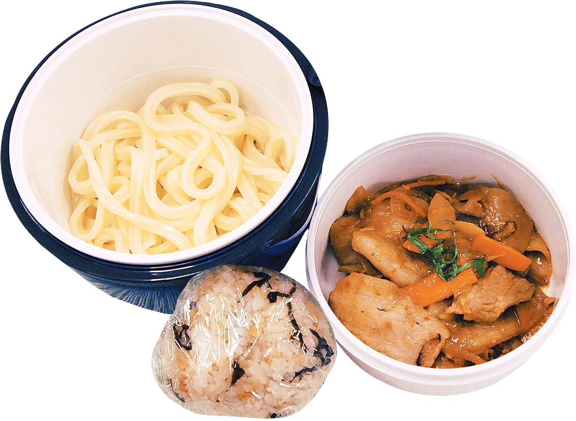 ⚫︎生姜焼きご飯のイメージですが、あえて「うどん」にしてみました。うどんだけだと、寂しかったのでおにぎりも付けてみました。