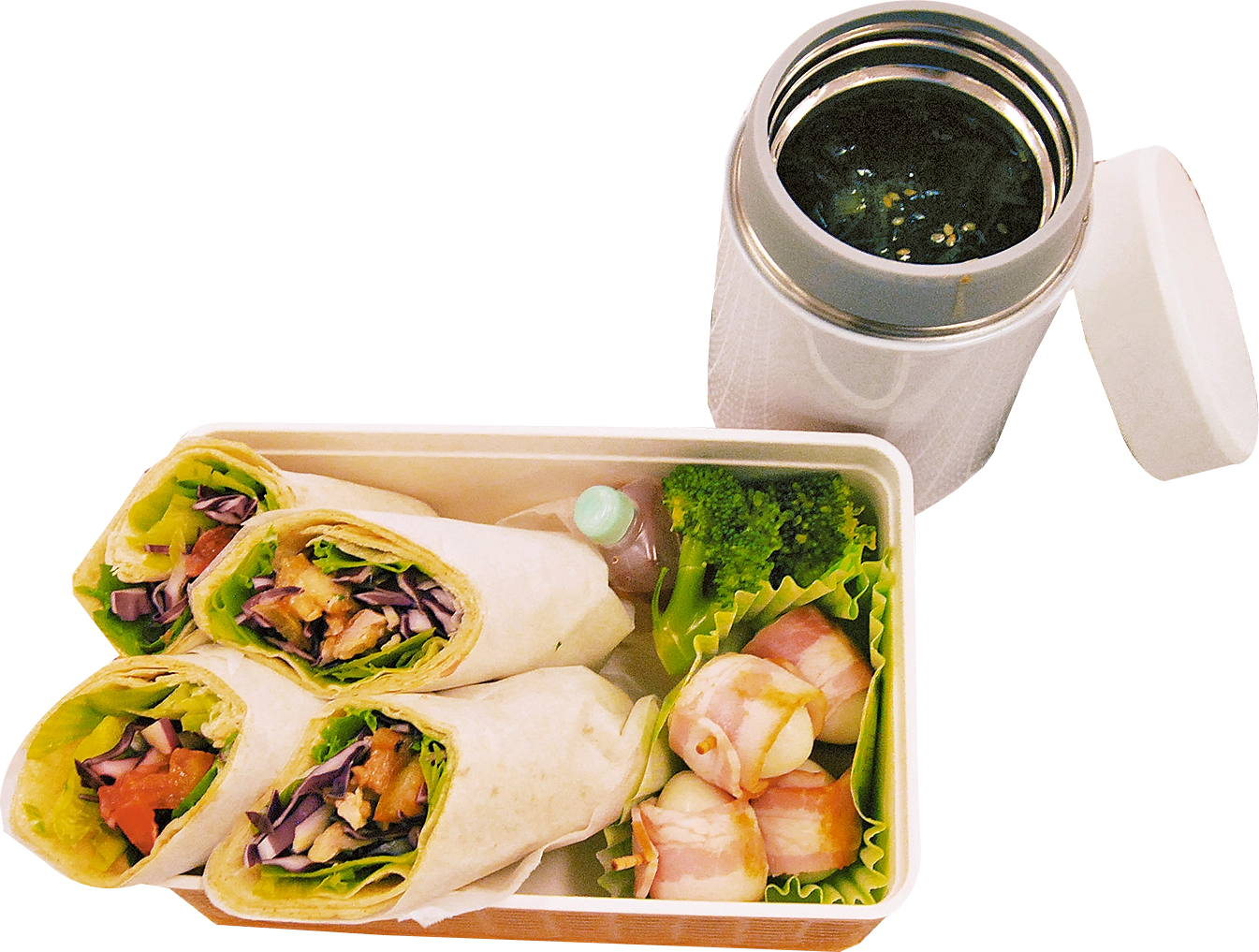 - 鶏肉を食べやすい大きさにカットし、レタス、キャベツ、トマトとトルティーヤで巻く。