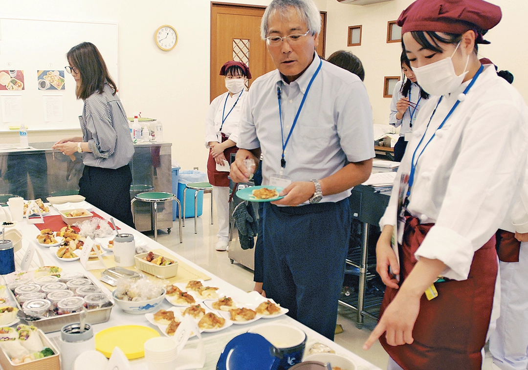 教室中央のテーブルに並んだ8点のお弁当と試食用サンプルを前に、学生によるプレゼンテーションが行われました。どのお弁当も学生自ら工夫を凝らした、ドライバーの立場に立ったメニューになっています。その後参加者はそれぞれの試食を行いながら、学生とのコミュニケーションを通して求評用チェックシートに記入。試食終了後講評が行われ、佐藤会長からは 「どのお弁当も工夫されており本当に低カロリーなのかと驚いた。華やかな色使いで食欲が刺激された」。学生からは 「ドライバーさんはたくさん食べると聞きました、ボリュームがありカロリーを低くすることが難しかったけれど、喜んでもらえてよかったです」との感想が述べられました。